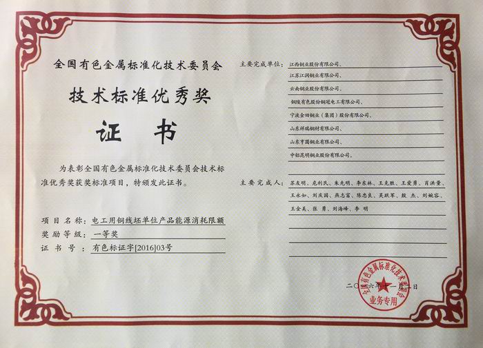 與此同時(shí),我公司獲得由全國(guó)有色金屬標(biāo)準(zhǔn)化技術(shù)委員會(huì)頒發(fā)的“技術(shù)標(biāo)準(zhǔn)優(yōu)秀獎(jiǎng)(一等獎(jiǎng))”。