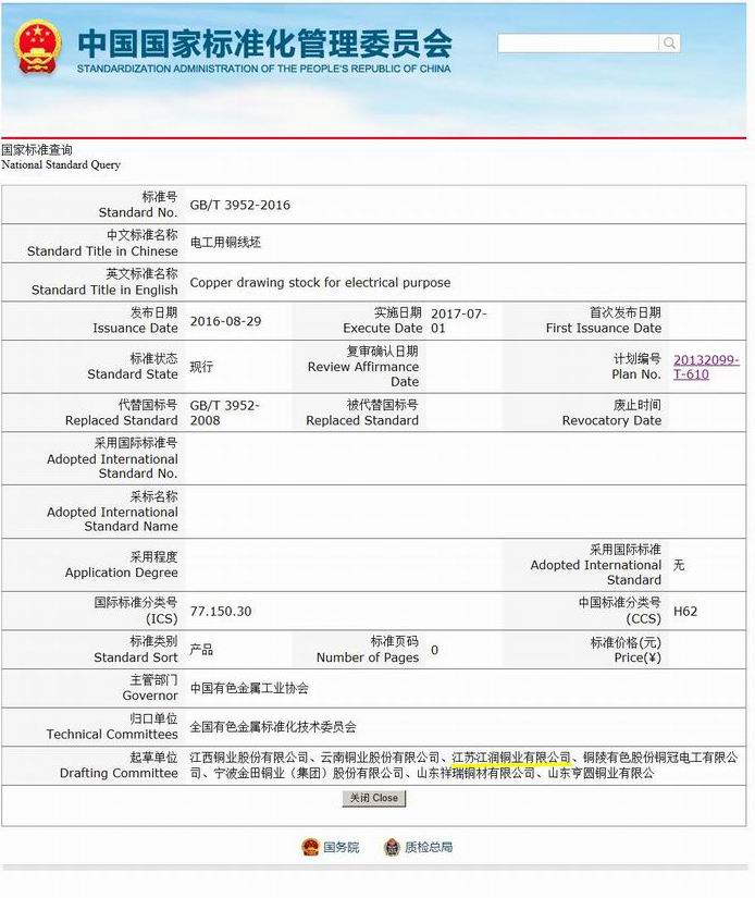 該標(biāo)準(zhǔn)由江潤(rùn)銅業(yè)、江西銅業(yè)、云南銅業(yè)等七家單位共同起草制定,這是公司繼參與起草修訂《電工用銅線坯單位產(chǎn)品能源消耗限額》、《電工圓銅線》、《鍍錫圓銅線》、《電工軟銅絞線》、《鍍銀軟圓銅線》國(guó)家標(biāo)準(zhǔn)后,又一次參與國(guó)家標(biāo)準(zhǔn)的起草修訂工作。