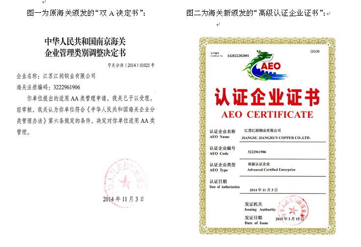 2015年7月30日,由無錫關檢貿組織的“共創共建”啟動儀式在無錫隆重舉行,參會企業共十五家。會議議程為原無錫市15家海關AA類管理的企業直接過渡為海關高級認證企業。江蘇江潤銅業有限公司榮獲由南京海關頒發的“高級認證企業”的稱號,公司總經理駱偉棟參會并領獎。《中華人民共和國海關企業信用管理暫行辦法》去年12月1日實施后,海關注冊企業的管理類別從原來的AA、A、B、C、D類劃分,改為按企業信用狀況劃分為認證企業、一般信用企業和失信企業,其中認證企業又分為一般認證企業和高級認證企業。認證企業在通關時適用較低的貨物查驗率,單證審核程序相對簡化,并可以優先辦理海關通關手續。  高級認證企業,除享有一般認證企業的通關便利外,其進出口貨物在確定商品歸類、原產地確定、海關估價和辦結其他海關手續前可先行驗放,由海關統一設立協調員,提供便捷通關服務。走出國門后,高級認證企業更可享受與中國實現AEO互認國家或地區海關提供的通關便利,這相當于直接獲得一張在全球有關國家或地區快速通關的VIP卡。